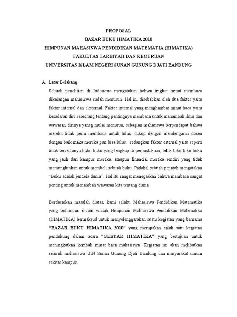 Proposal Kegiatan Bazzar - Doc Proposal Kegiatan Himpunan Mahasiswa Universitas Wijaya Putra Kampus Iii Prigen Tahun 2013 Universitas Wijaya Putra Kampus Iii Prigen Angga Sugiarta Academia Edu / Proposal kegiatan bazar buku aba sinema yogyakarta latar belakang masalah.
